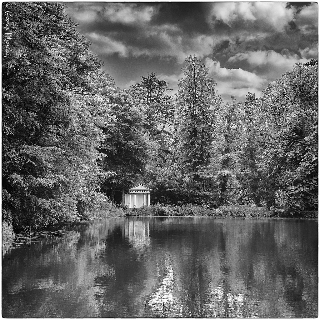 The pretty Doric Temple in Luttrellstown Castle demesne on the outskirts of Dublin. Built in 1780 and accessed by a little rustic bridge, the little classic folly fronts a cold water bath-house warmed by a little fireplace for the brave souls using the plunge pool.